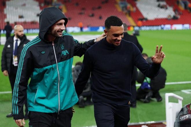 如今,阿诺德代表皇马重返安菲尔德,进入替补席,赛前,阿诺德和前队友索博斯洛伊重聚,两人肩并肩,面带微笑。