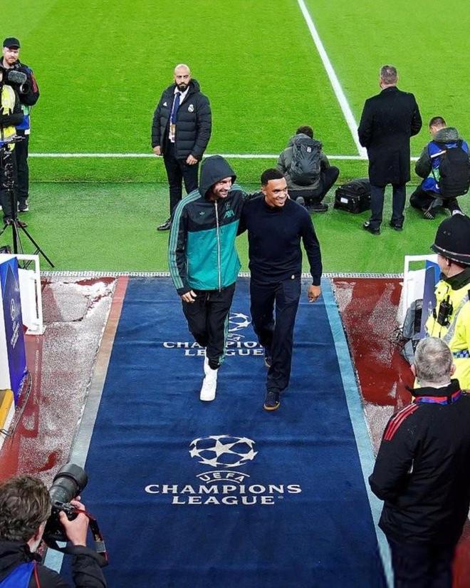 欧冠联赛阶段第四轮,利物浦主场对阵皇家马德里,重返安菲尔德的阿诺德替补待命,赛前他和前队友索博斯洛伊肩并肩走入球员通道。